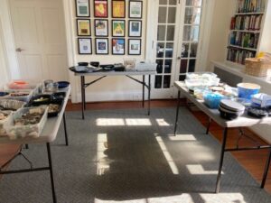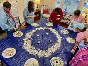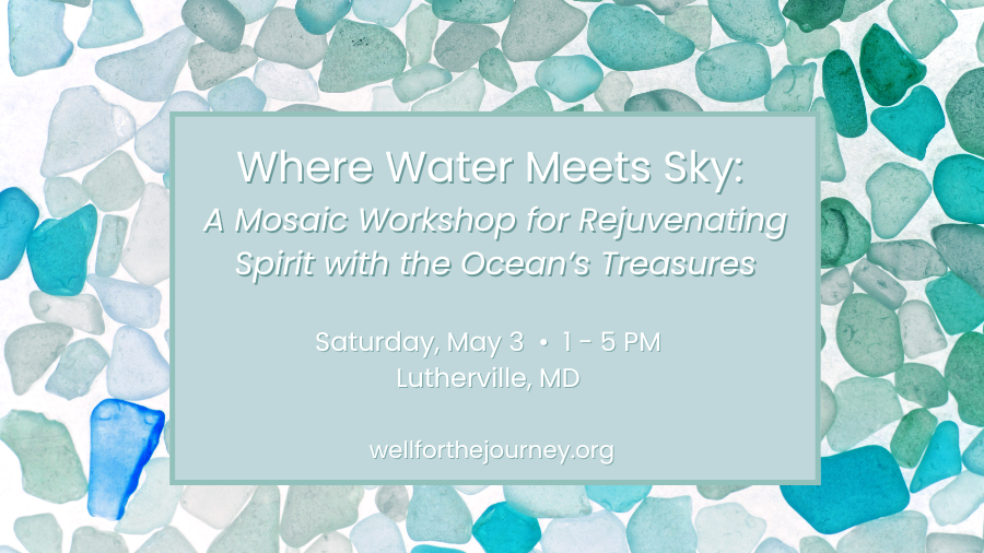 We are delighted to welcome back Baltimore artist, Cinder Hypki, for her fourth mosaic offering at the Well! Cinder brings years of experience guiding groups in creative activities for celebration, exploration and healing. No prior experience with mosaics or any art form is required to participate. Cinder brings her mobile mosaic studio to the Well and guides every step of this fun, creative, and life-giving process. You have the option to bring your own beach combed treasures or work with a beautiful assortment of Cinder’s pottery shards, sea glass, and shells.
